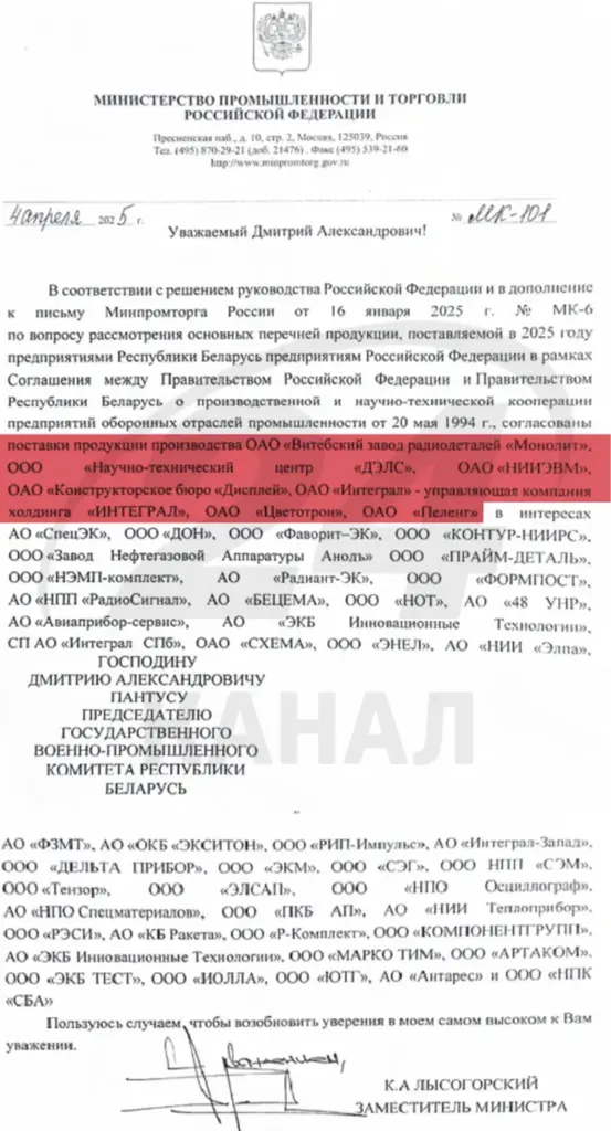 According to a letter from Kirill Lysogorsky, Russia’s Deputy Minister of Industry and Trade, sent to Dmitry Pantus, head of Belarus’s state military-industrial committee, in 2025 the governments approved shipments to Russia from: