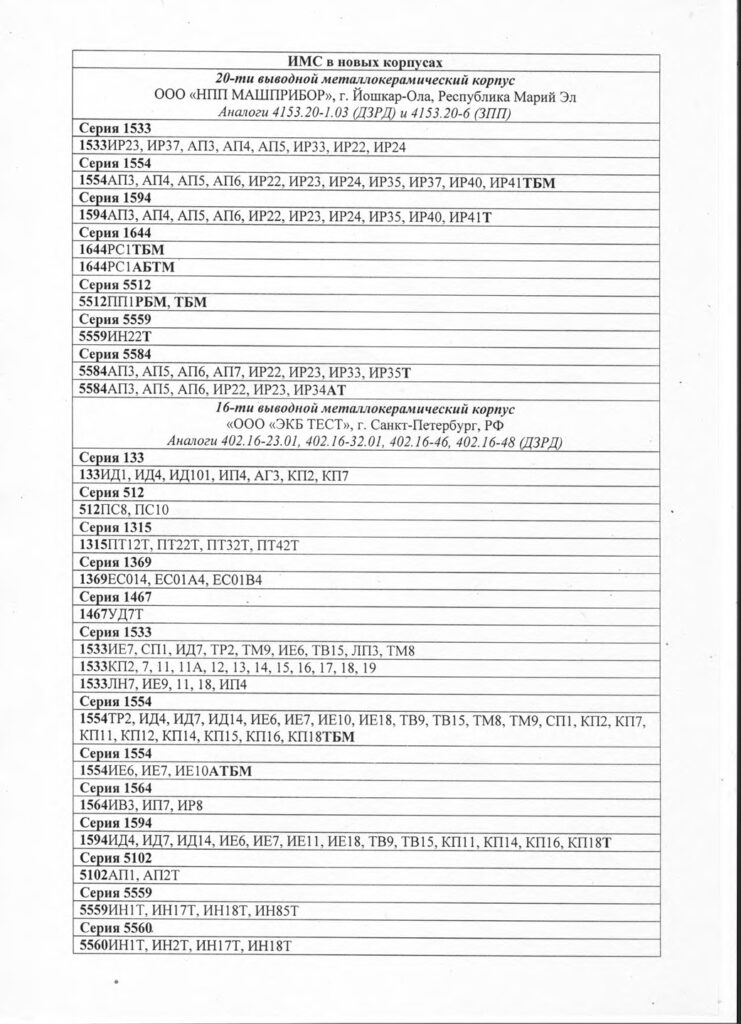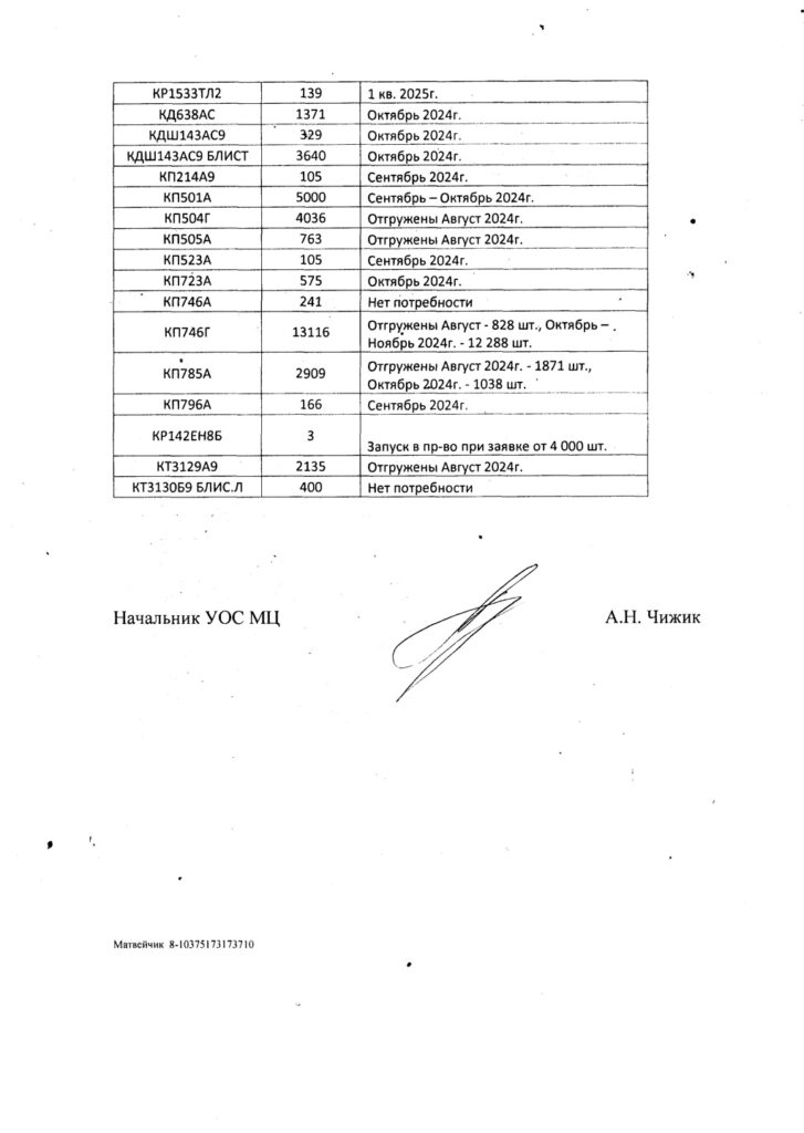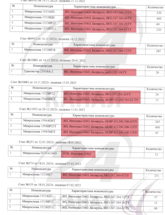 See document listing some microchips produced by Belarus’s “Integral” for Russian defense enterprises: