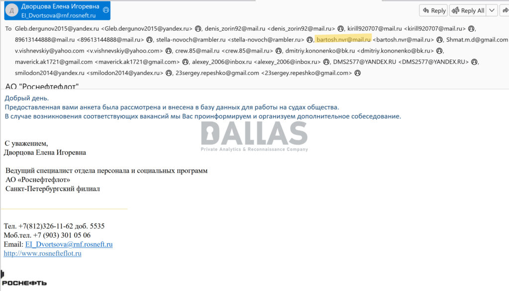 Варто звернути увагу, що електронний лист відправлено з домену techshipman.com, який відрізняється від офіційного домену «Совкомфлоту» scf-group.com. Цей сайт, імовірно, використовується для організації внутрішньої логістики та судноплавних процесів, водночас виконуючи роль комунікаційного каналу, формально не пов’язаного з SCF.